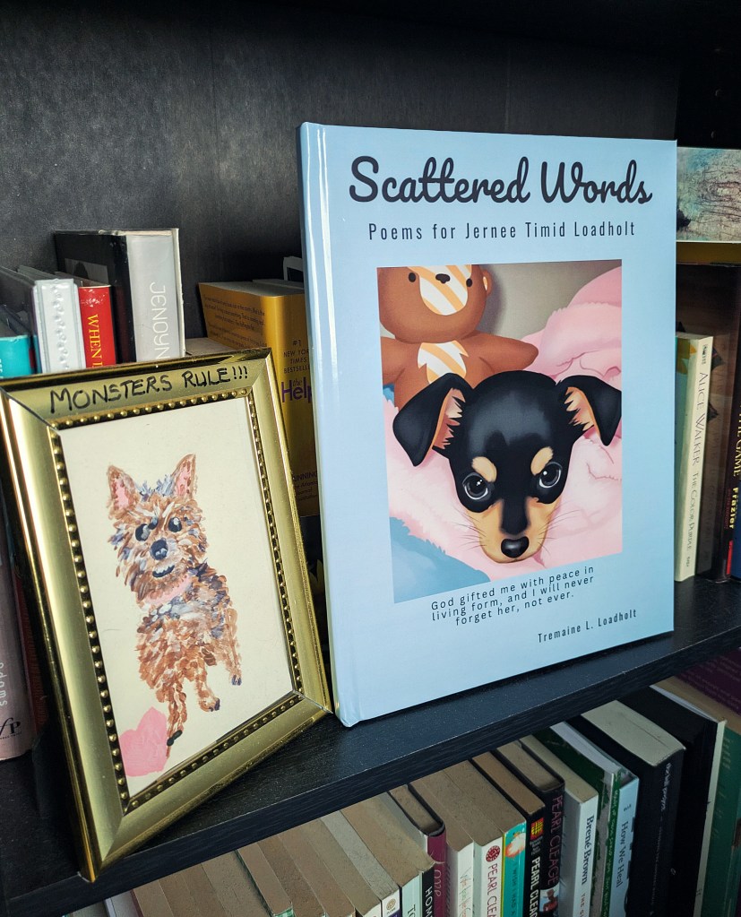In Scattered Words: Poems for Jernee Timid Loadholt, the author wants you, the reader, to experience Jernee in totality and understand why she has lost the greatest companion she has ever known. If you have ever grieved the loss of a pet, many of these poems will not only resonate with you, they will set up holding spaces in your mind, crawl into your heart, and retreat only when they have been commanded to do so.