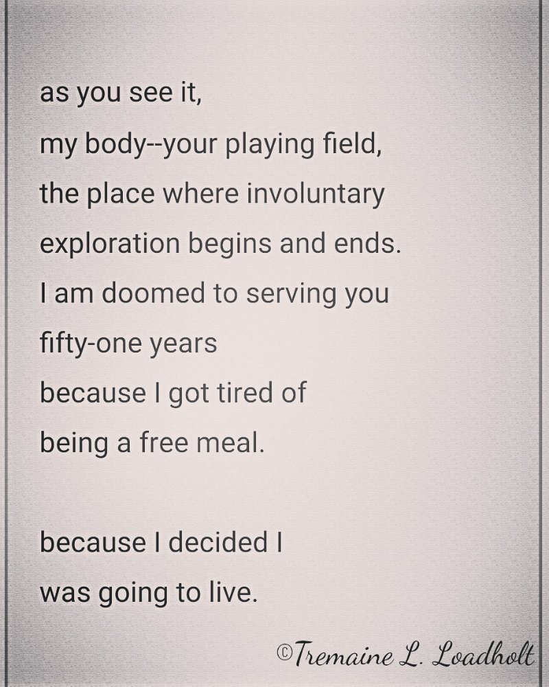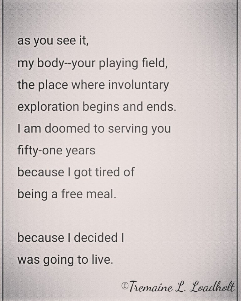 51 (for Cyntoia) 12/14/201812/14/2018trE 51 (for Cyntoia): when a woman’s body has been made into a man’s playing field, justice is almost always invisible. Originally shared via A Cornered Gurl on Instagram.