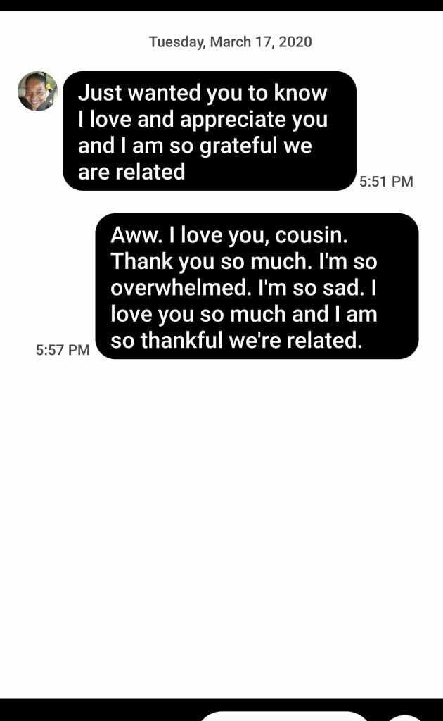 Sharing that moment with her, which reflected the beauty of her mother and the lives lost around her, caused me to smile through the pain. Here was my younger cousin honoring her late mother in such a way one could not fathom its fruition. I told her I wanted to see the finished product, and I am certain she will share it with me.