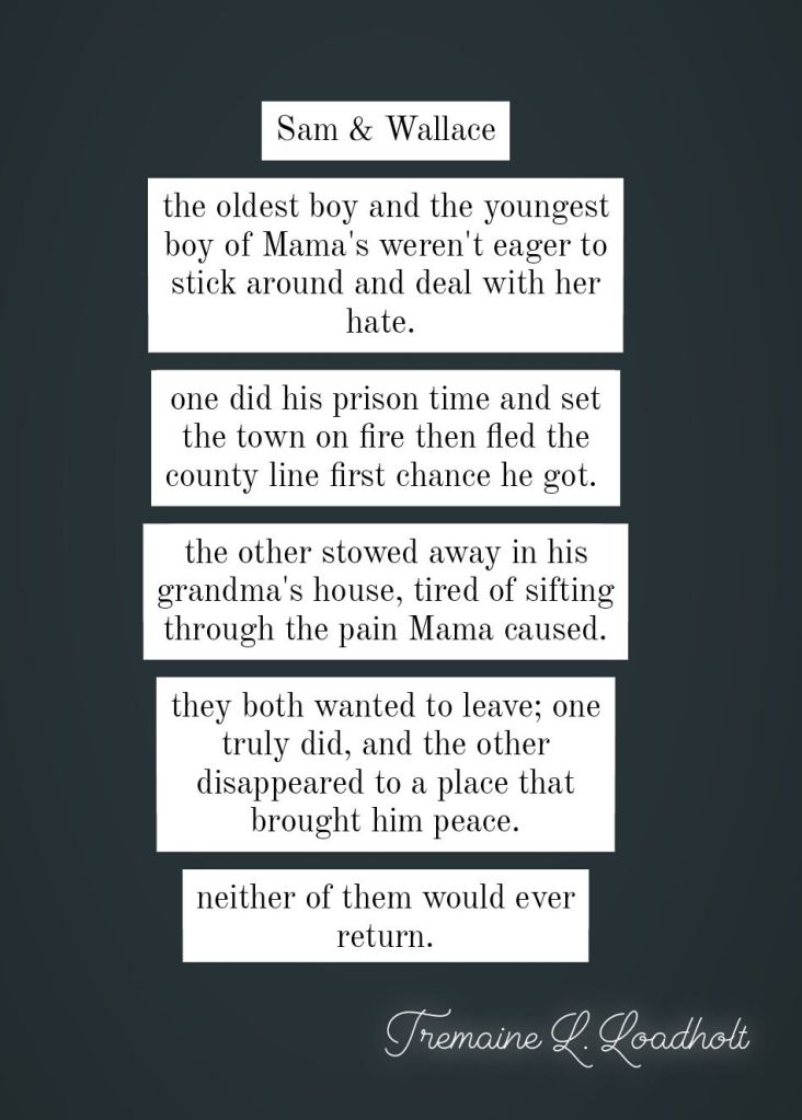 This is the fifth and final poem in a series I was doing about the characters in the book I read, called The Darkest Child.