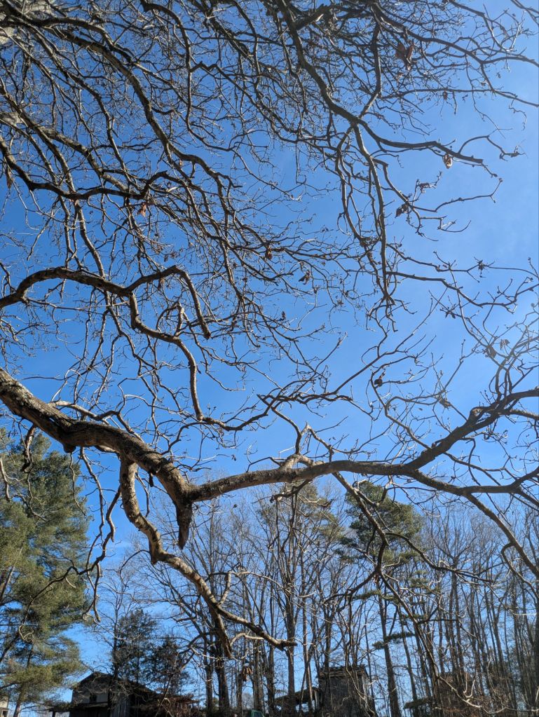 Trees and Sky #3. A different view. I can stand out here for hours if my legs allow it. I visited with Jernee for 4o minutes before Karlie came out with her dog, two other kittens, and then all the chickens started coming toward us, too. I ended up spending an hour and fifteen minutes total out in the country (East Bend, NC), instead of just 30 minutes. And you know what? I needed every second of it! Saturday, December 20, 2025. Photo Credit: Tremaine L. Loadholt