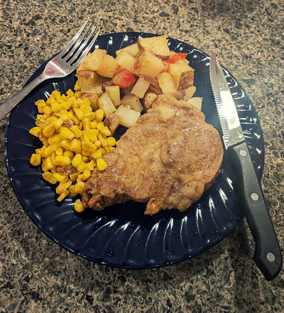 A hearty meal for an empty belly. Seasoned pork steak, sweet corn, and roasted Rustic potatoes w/ Roma tomatoes. Sunday, January 18, 2026. Photo Credit: Tremaine L. Loadholt