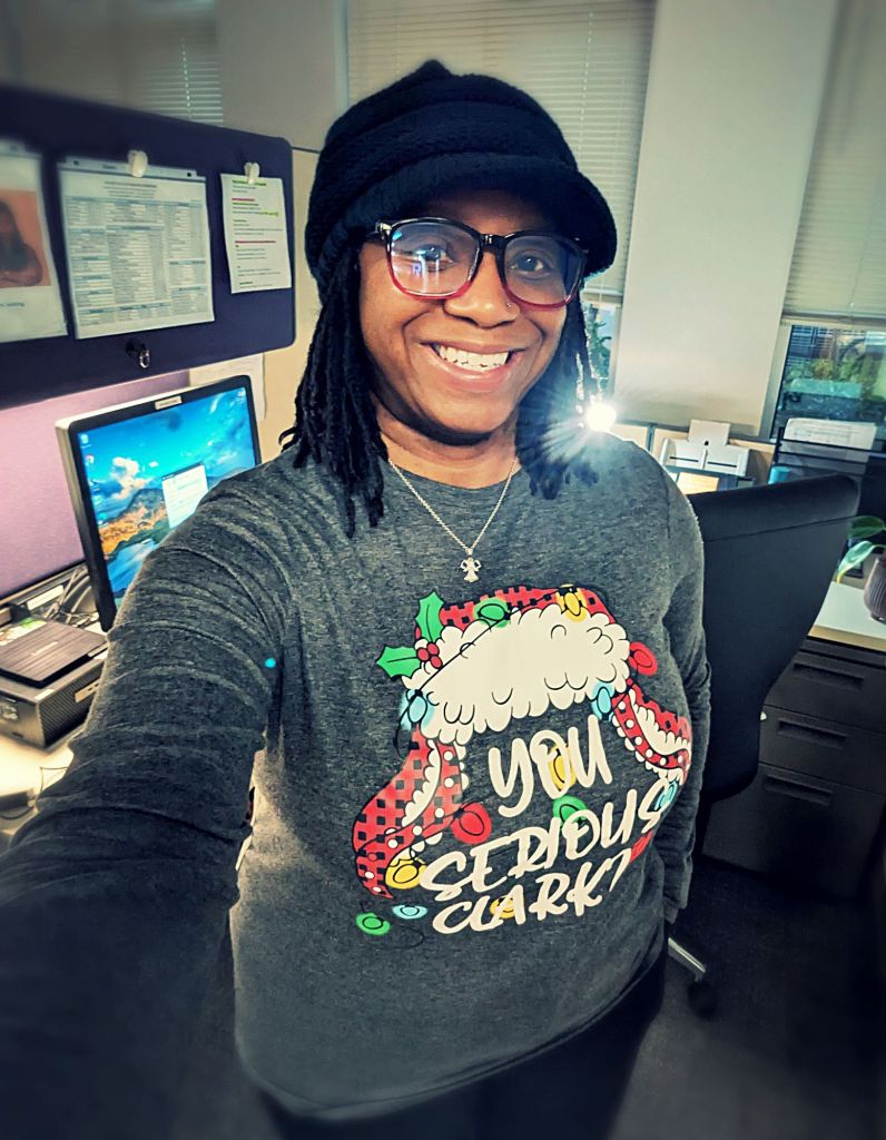 My little home away from home: my cubicle space at work. Tuesday, December 16, 2025. Do you know which movie my Christmas shirt is referencing?! Photo Credit: Tremaine L. Loadholt