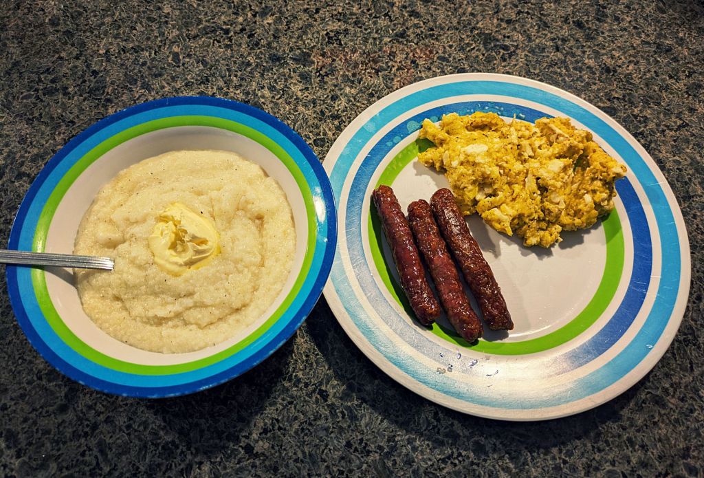 Sunday morning breakfast. Grits, cheesy scrambled eggs, and sausage links. Sunday, December 14, 2025. Photo Credit: Tremaine L. Loadholt