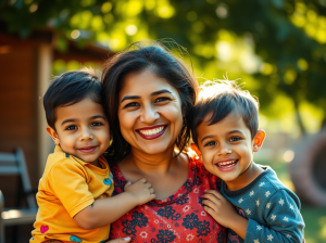 AI-Generated Image: A Hispanic woman cuddling her two boys. She has a beautiful smile, and both boys are leaning into her, engaged with the camera. There is a blurred background of green and perhaps a playground out of sight, too?