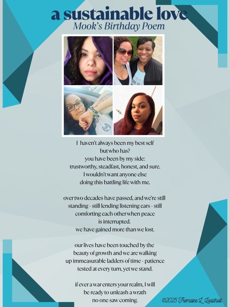 I am certain, if you have been reading my work for years, you’ve seen many poems written about and for Mook. Today is her birthday, and I am blessed beyond measure to still know, still love, still be able to look at this woman and say, “Hey! That’s my best friend, and I will go to war for her!” Because I will. Happy Birthday, boo! May it be everything you want and need it to be from this moment and for all to come.