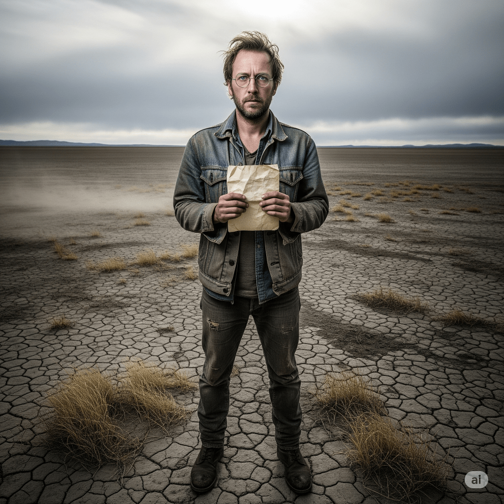AI-Generated Image. Created with Google Gemini. A White man with short, messy hair, standing in the middle of nowhere, holding up a crumpled letter. He is dressed in faded jeans with a matching jacket. He is wearing glasses and has a mustache running into a beard. Above him, the sky is dark & gloomy.